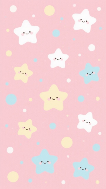 柔和的浅粉色背景,上面散布着大小不一、圆润可爱的白色、浅黄色和浅蓝色五角星图案,以及许多细碎的同色系小圆点作为点缀,整体呈现出简洁、明快、充满童趣的可爱氛围,色彩搭配柔和甜美,构图疏密有致,营造出轻松愉悦的视觉感受。