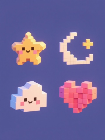 4个完全不同造型的可爱像素风格立体元素系列素材集合,包括像素爱心、像素星星、像素云朵和像素月亮,每个元素均采用粉色为主色调,黑色像素边框勾勒轮廓,表面有白色高光块表现立体光影,所有元素规整排布在纯白色背景上,保持8-bit像素艺术的复古质感和可爱视觉风格