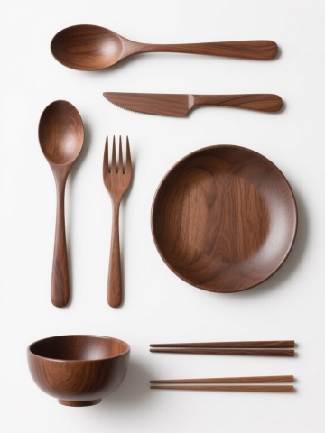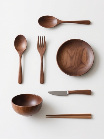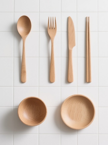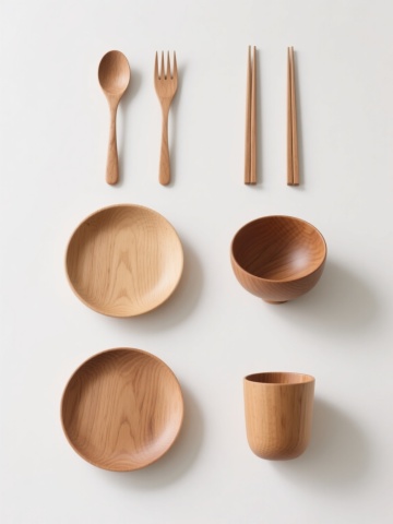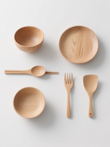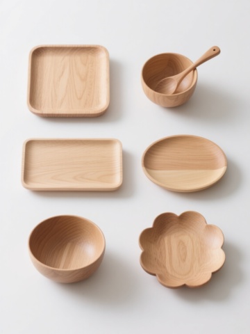 一张极简风格的静物海报,六个不同形态的木质餐具(如方形木盘、带柄木碗、长方形木托盘、椭圆形木碟、浅口木钵、花瓣形木盘)整齐排列成两行三列,每个餐具均展现出与原图一致的浅色实木纹理、细腻光滑的表面质感和自然的木纹走向,统一采用纯白色纯色背景,光线柔和均匀,突出木质的温润光泽和简约设计感,整体构图平衡对称,视觉层级清晰,传达出自然、质朴、高端的生活美学,符合现代简约家居用品的宣传风格。