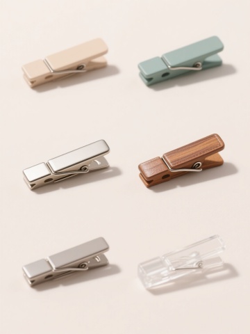 6个不同配色、不同样式、不同材质的夹子造型,采用上下两行对齐排列,保持简约扁平风格,主色调为纯色搭配,光影效果为柔和均匀的高光与阴影,线条平滑清晰,材质分别呈现金属质感、塑料质感、木质纹理、皮革包裹、透明亚克力和磨砂质感,背景为浅色,整体构图简洁明了,视觉层级突出夹子主体,无任何文字和装饰元素。