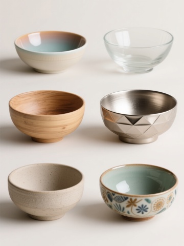 六个不同配色、不同样式、不同材质的碗造型,每个碗具有独特的设计感,有的是光滑陶瓷质地配以柔和渐变色彩,有的是磨砂玻璃材质呈现通透感,有的是木质纹理搭配自然色调,有的是金属光泽带有几何纹路,有的是粗陶质感展现质朴风格,有的是釉彩工艺点缀精美图案,所有碗在浅色背景上呈上下两行整齐对齐排列,整体构图简洁大方,视觉层次分明,突出碗的形态与材质美感,具有现代产品展示海报的设计感,信息传达清晰,适合家居用品宣传。