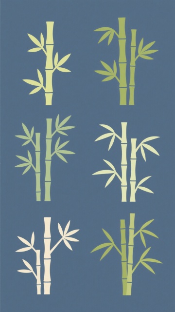 纯色背景上,六个完全不同造型的竹元素系列素材集合规整排布,每个竹元素均保持原有的简约平面插画风格,线条流畅,无渐变和阴影,竹节和竹叶结构清晰可辨,整体色彩进行变换,每个造型的竹子拥有独特的姿态和竹叶分布,整体排版整齐有序,视觉上形成统一又富有变化的系列感。