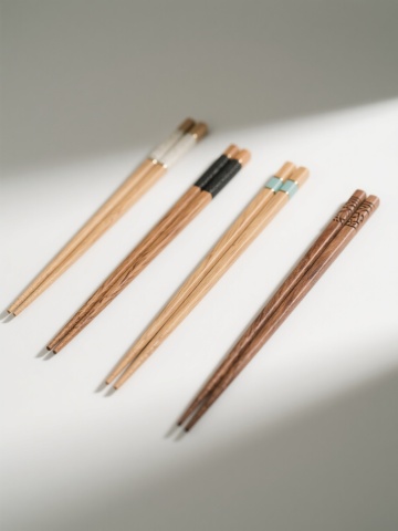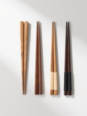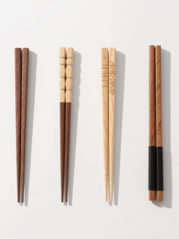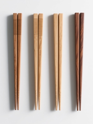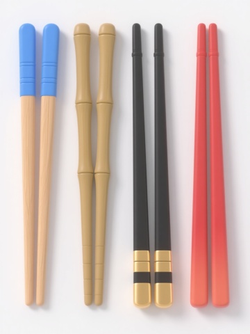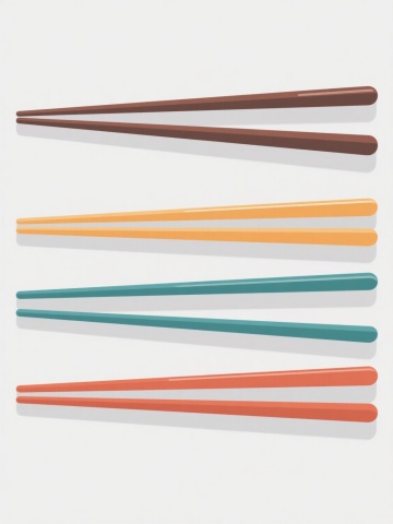 四双不同样式、不同种类、不同配色的筷子,白色背景,排列整齐,采用简约的2D矢量插画风格,线条平滑流畅,色彩明快且饱和度适中,每双筷子具有独特的设计元素,如不同的顶部形状、中段装饰纹路或末端颜色搭配,整体呈现出干净利落的视觉效果,无阴影或极简阴影处理,保持画面的清爽与整洁,构图对称均衡,筷子平行排列或呈有规律的阵列分布,展现出有序的美感和清晰的视觉层次。