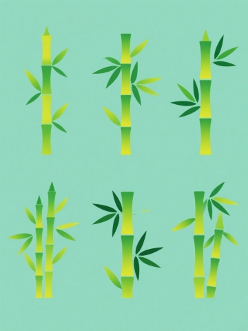 一套六个不同造型的绿色竹子图案,每个图案都保持了简约、扁平的设计风格,采用纯色背景,整体色彩统一为绿色系,竹子的形态各异但元素内容保持一致,六个图案规整地排布在一起,形成一个系列素材集合,视觉上简洁明了,具有良好的整体性和系列感。