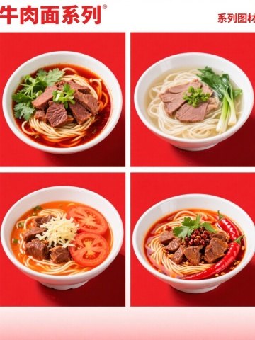 超写实美食摄影风格,纯色背景,四个造型完全不同的牛肉面元素内容规整排布组成系列素材集合。每个牛肉面均使用原图中带蓝色花纹的传统瓷碗盛装,保持浓郁的红色汤底、晶莹的面条、切片牛肉、绿色香菜和葱花等核心元素的质感与光影表现。第一个碗中牛肉片整齐码放,面条缠绕成螺旋状;第二个碗中牛肉呈块状,搭配更多的青菜和豆芽;第三个碗中面条舒展,牛肉片斜切交错摆放,点缀白芝麻;第四个碗中加入卤蛋和豆腐泡,牛肉片与蔬菜分层放置,整体构图保持对称平衡,色彩鲜艳,细节清晰,突出食物的新鲜感和诱人光泽。
