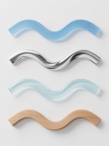 白色纯色背景上,规整排布四个完全不同材质的同元素同造型波浪线系列素材集合,每个波浪线均保持原始流畅的连续曲线造型,从左到右分别为:哑光磨砂质感的天蓝色塑料波浪线,表面带有细微颗粒纹理;光滑高反光的金属银色波浪线,边缘锐利且有镜面反射效果;半透明磨砂玻璃质感的淡青色波浪线,带有柔和的透光效果和细腻的磨砂纹理;具有温暖光泽的木质波浪线,呈现自然的浅棕色木纹肌理和轻微的凹凸触感,整体设计简洁现代,视觉层级清晰,元素排布均衡对称,信息传达高效,符合现代简约设计感。