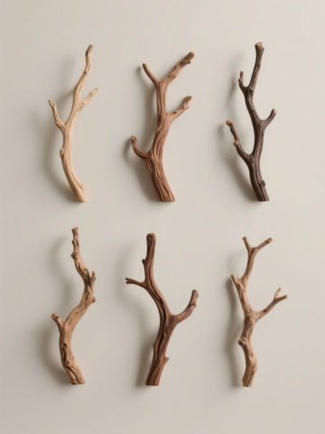 六个不同配色、不同样式、不同材质、不同粗细的树枝造型,每个树枝都具有独特的自然纹理和弯曲形态,呈现出真实的木质质感与细节,上下两行对齐排列,背景为浅色,整体构图简洁、对称且具有设计感。