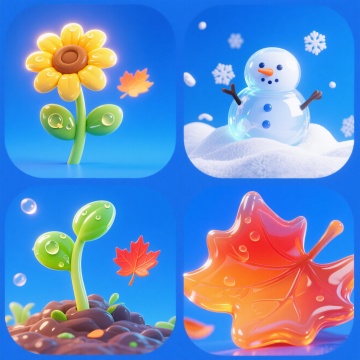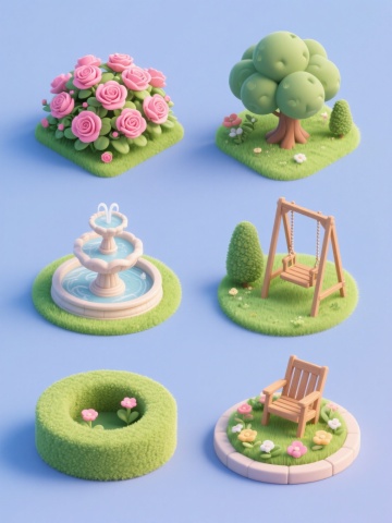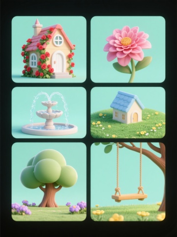 软3D风格的花园系列素材集合,纯色背景,整体色彩变换为清新明快的蓝绿色调,保持原有的软3D视觉质感和光影效果。画面中规整排布六个完全不同的花园元素内容:左侧上方是带有红色屋顶和白色墙壁的小房子,周围环绕着绿色灌木丛;右侧上方是盛开的粉色和白色花朵组成的花簇,花瓣层次分明;左侧中间是圆形的喷泉,水柱向上喷射,底部有圆形水池;右侧中间是修剪整齐的绿色草地,上面点缀着黄色的小花;左侧下方是高大的绿色大树,树干粗壮,枝叶茂密;右侧下方是悬挂在树枝上的棕色秋千,秋千绳自然垂下。所有元素均采用软3D风格,色彩统一为蓝绿色调,元素之间留有适当空隙,整体布局规整有序,形成一个协调统一的花园系列素材集合。