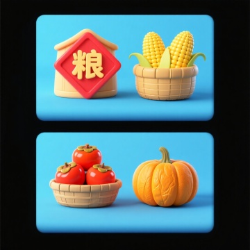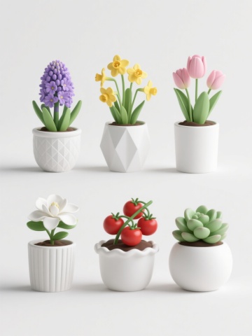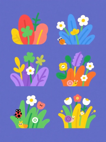 6个完全不同造型的农场植物元素系列素材集合,每个元素均为方形土地区域内种植的不同生长阶段的农作物,采用Q版卡通风格,色彩鲜艳明快,线条清晰,具有立体感和细节刻画,包括不同形态的蔬菜和植物,所有元素规整排布在纯白色纯色背景上。