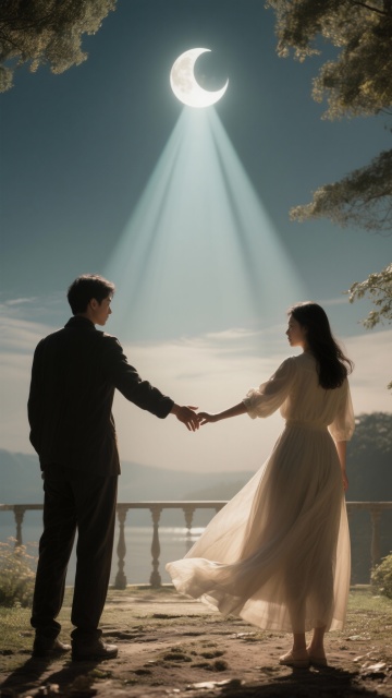 梦幻插画风,情侣桥上相拥,心形光圈环绕,满月星空背景,浪漫超现实主义场景。