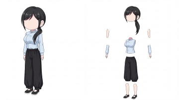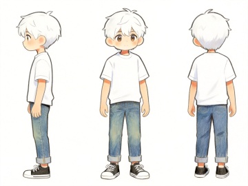可爱感十足的动漫风插画,水彩质感细腻柔和,呈现角色三视图设计,简约日常穿搭,清新自然。