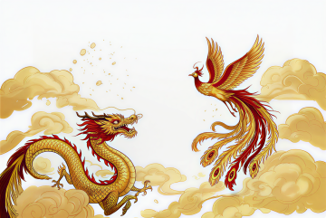 中国传统国潮风格插画,一只色彩绚丽的凤凰展翅飞翔,主体羽毛呈橙红色渐变,翅膀羽毛尖端为明亮的黄色,带有金色高光点缀,头部有精致的红色冠羽,颈部羽毛层次分明,尾部拖着飘逸的五彩长尾,包含红色、橙色、绿色和黄色的卷曲飘带,周围环绕着传统祥云图案,云朵呈白色、浅黄和橙色,线条流畅优美,整体构图充满动感与力量,色彩浓郁和谐,具有鲜明的中国传统文化韵味和现代设计美感,画面背景为纯白色,突出主体形象的精致细节和华丽色彩。
