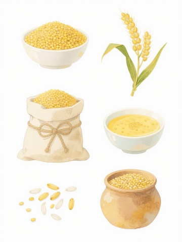 纯手绘水彩风格的小米主题系列插画,以干净的白色为背景,包含六个完全不同的小米元素内容,每个元素都保持统一的水彩质感、细腻的笔触、明亮的黄色调与绿色叶子的自然配色,以及写实的光影效果。元素包括:1. 一堆饱满圆润的小米颗粒,散落几颗;2. 一株带绿叶的完整小米穗,颗粒饱满低垂;3. 一个装满金黄色小米的棕色陶碗,碗口边缘有少量溢出的米粒;4. 一袋用麻绳系口的透明玻璃纸袋包装的小米,袋子略微鼓起,能看到内部颗粒;5. 一碗刚煮好的小米粥,表面有自然的光泽和少量气泡;6. 几颗小米种子在一片绿色叶子上,叶子有清晰的叶脉纹理。所有元素规整排布,彼此之间留有适当空隙,整体构图平衡,突出小米的自然质感与原生态美感,无任何文字或装饰元素。