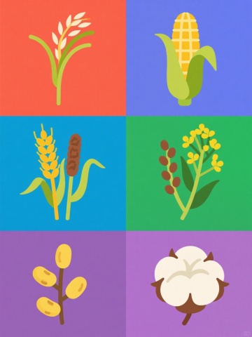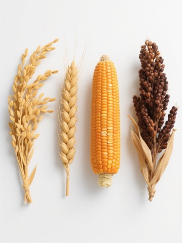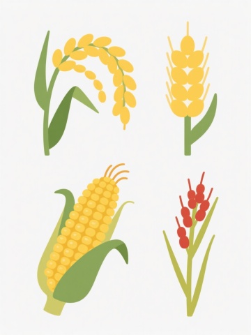 一套四个不同谷物元素的系列插画,保持与原图一致的扁平卡通风格,明亮的色彩,简洁的线条和渐变填充。每个元素独立呈现,分别是饱满的金黄色稻穗、下垂的金黄色小麦麦穗、颗粒圆润的金黄色玉米棒子和饱满的金黄色高粱穗,每个谷物都有绿色的茎和叶子,所有元素规整排布在纯色背景上,构图均衡,视觉统一。