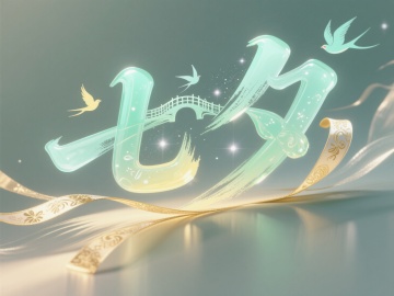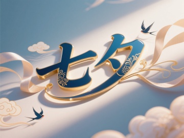 带有光影效果的“七夕”艺术字体,字体边缘呈现出柔和的光晕,仿佛在星空下闪耀,可加入流星、银河等背景元素,营造出梦幻神秘的氛围。