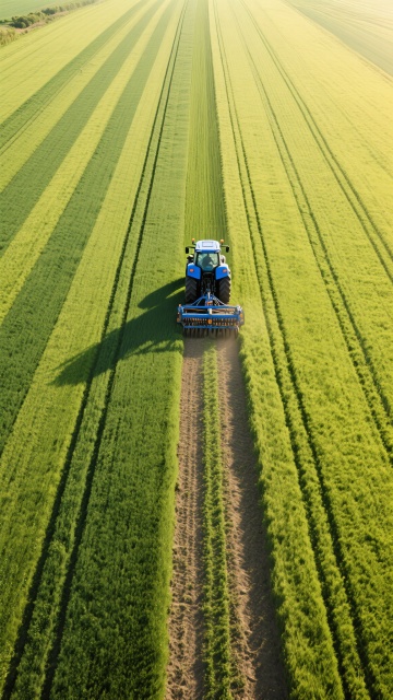 航拍视角下的农业田野,广阔的绿色田野上分布着深浅不一的黄色收割条纹,形成富有韵律感的波浪状曲线,一台正在作业的联合收割机位于画面中央偏上位置,展现出丰收的景象和现代农业的高效,整体色调以绿色和金黄色为主,光线明亮自然,突出田野的层次感和纹理细节,营造出宁静而充满生机的农业生产氛围。