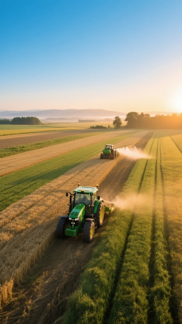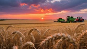 油画风麦田,夕阳洒金,机械剪影,宽阔实景,光影浪漫。