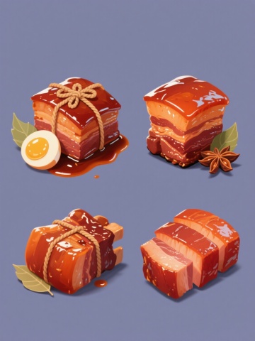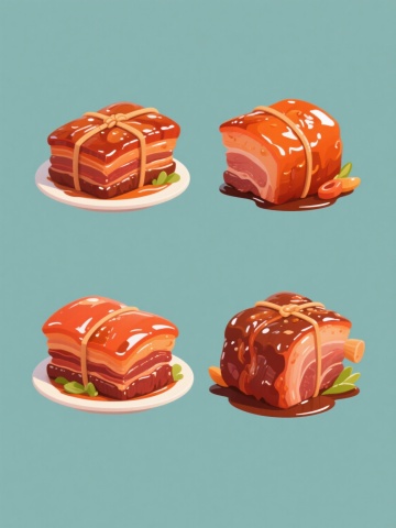 一组6个中国传统美食的插画集合,保持与原图一致的手绘水彩风格,厚重笔触与明亮色彩,每个美食都有高光和阴影细节,纯色背景,规整排布。包含:东坡肉(用麻绳捆绑的方形红烧肉)、北京烤鸭(片好的鸭皮带有脆皮光泽)、麻婆豆腐(红色豆瓣酱覆盖的嫩豆腐块)、鱼香肉丝(胡萝卜丝、青椒丝和肉丝的混合)、宫保鸡丁(花生米和鸡肉块的组合)、小笼包(褶皱分明的白色包子)。