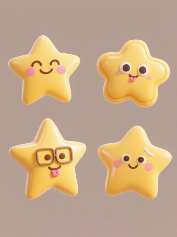 一系列6个不同表情的3D立体黄色圆形表情图标,保持与原图一致的圆润光滑质感、明亮橙黄色渐变、柔和高光与阴影效果、简洁可爱风格,表情包括:眨眼微笑、惊讶睁眼、嘟嘴亲吻、调皮吐舌、委屈撇嘴、冷静酷脸,每个表情图标周围点缀2-3颗小黄色星星,所有图标排列规整,背景为纯色,无文字、二维码及其他装饰元素。