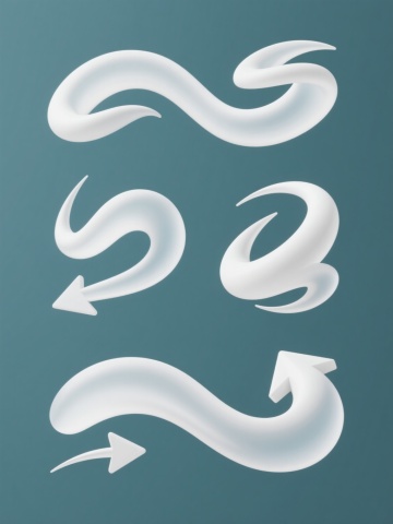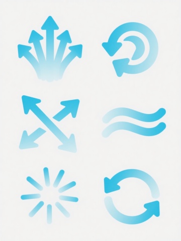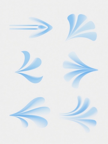 白色纯色背景,6个不同的蓝色气流图标元素规整排布的系列素材集合,每个图标都具有平滑的曲线和箭头形状,采用统一的浅蓝色渐变色调,保持简洁现代的设计风格,图标之间留有均匀的间距,整体呈现出整齐有序的视觉效果,每个气流图标都有独特的流动形态和方向组合,包括向上汇聚的气流、旋转上升的气流、分叉流动的气流、波浪形流动的气流、对称分布的气流以及螺旋状上升的气流。