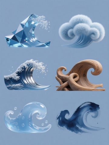 六个完全不同材质和造型的浪花图案,均采用纯色背景,保持浪花核心内容但形态各异。第一个浪花为晶莹剔透的玻璃材质,呈现不规则几何切割造型,边缘锐利,带有折射光斑;第二个是柔软的绒毛材质,造型圆润蓬松,边缘呈波浪状卷曲,整体像一朵漂浮的云;第三个为金属材质,呈现出工业风的棱角分明造型,表面有拉丝纹理和反光效果;第四个是木质材质,造型模仿自然木纹的走向,呈现出有机的曲线和结节;第五个是透明的果冻材质,造型饱满Q弹,带有半透明效果和内部气泡;第六个是手绘水墨材质,造型写意流畅,边缘晕染模糊,呈现出东方艺术的韵味。所有浪花均保持蓝色调,但根据材质不同呈现出深浅不一的蓝色变化,整体风格统一又各具特色。