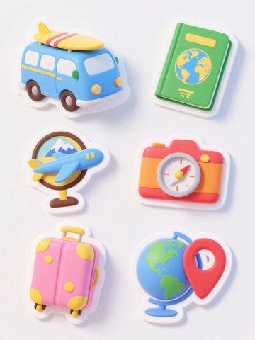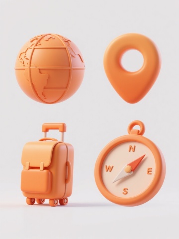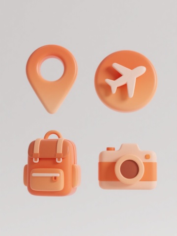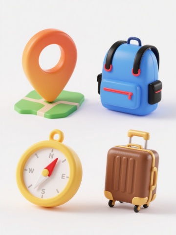 四个旅行相关元素以相同3D立体图标风格、纯色白色背景、规整网格布局排列,每个元素均采用渐变色彩处理,底部有绿色平台支撑:左上角为橙色渐变定位标记图标,右上角为蓝色渐变旅行背包图标,左下角为棕色渐变世界地图图标,右下角为红色渐变相机图标,所有元素保持统一的圆润边角、高光阴影效果和简洁现代设计感。