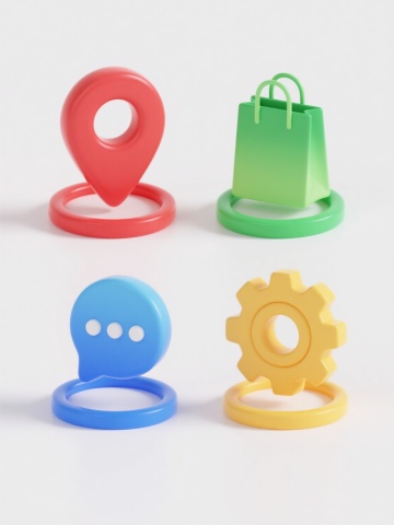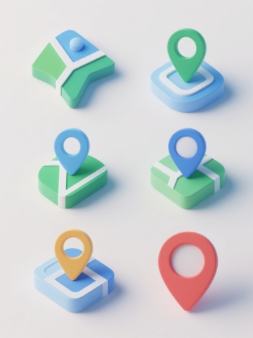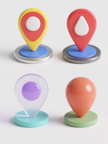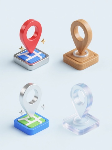 一组四个相同造型的地图定位标记图标系列,每个图标具有完全不同的材质表现,规整地排列在纯色背景上。图标主体为上半部分的红色水滴状标记和下半部分的蓝色圆形底座的组合形态。第一个图标呈现光滑的塑料材质,表面有细腻的高光,色彩为明亮的柠檬黄标记配天蓝色底座;第二个图标为磨砂金属质感,带有细微的纹理和柔和的反光,色彩为深灰色标记配银色底座;第三个图标是半透明的玻璃材质,边缘有光晕效果,色彩为淡紫色标记配浅青色底座;第四个图标为哑光陶瓷质感,表面温润无明显反光,色彩为橙红色标记配橄榄绿底座。所有图标保持一致的简约扁平风格,造型结构完全相同,仅在材质和整体色彩上做变换,整体布局整齐有序,背景为纯白色。