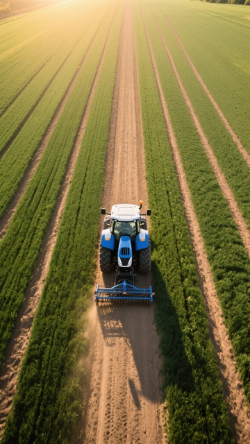 从高空俯瞰的现代农业田野景观,广阔无垠的绿色农田被整齐的田埂分割成规则的块状,一台绿色的现代化农业机械正在田垄间行驶作业,远处另有一台农机在田间进行喷洒作业,金色的阳光洒满大地,天空呈现出清澈的湛蓝色并点缀着几缕薄云,地平线处可见连绵的树木和朦胧的远山轮廓,整体画面展现出农业生产的生机勃勃与现代化气息,光线明亮柔和,色彩饱和自然,具有强烈的视觉纵深感和开阔感。
