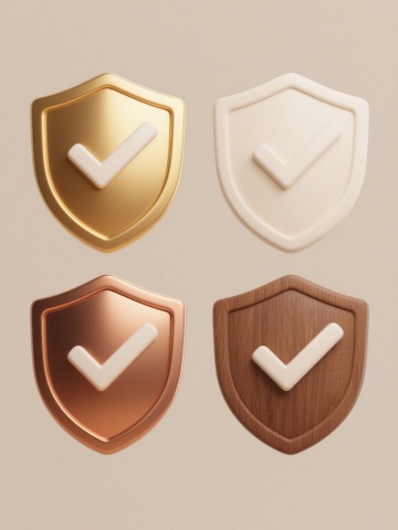 系列盾牌图标集合,保持原盾牌造型及中央白色对勾符号,采用纯色背景,画面整体色彩变换,6个盾牌分别呈现完全不同材质:磨砂玻璃质感(浅绿色)、抛光金属质感(深金色)、哑光陶瓷质感(天蓝色)、木质纹理质感(棕褐色)、透明水晶质感(淡紫色)、柔软硅胶质感(粉红色),所有盾牌元素造型一致,规整排列成系列素材集合,每个盾牌均保留原有的立体感和光泽表现,整体构图平衡对称。