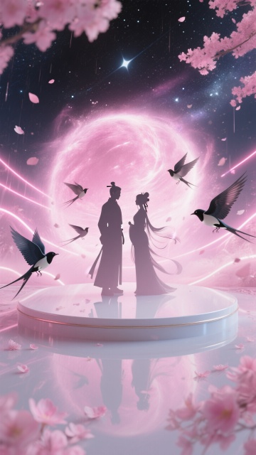 七夕传说,以满月、星河、鹊桥、飞鸟等元素构建梦幻场景,将传统鹊桥相会的浪漫与星空的浩瀚梦幻融合