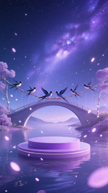 星空紫渐变银河蓝。乳白月轮,远处有鹊桥,桥上站着牛郎织女。喜鹊飞舞,前面有一个白色展台,淡黄光带。 淡紫粒子光尘。桥底流动深蓝星河