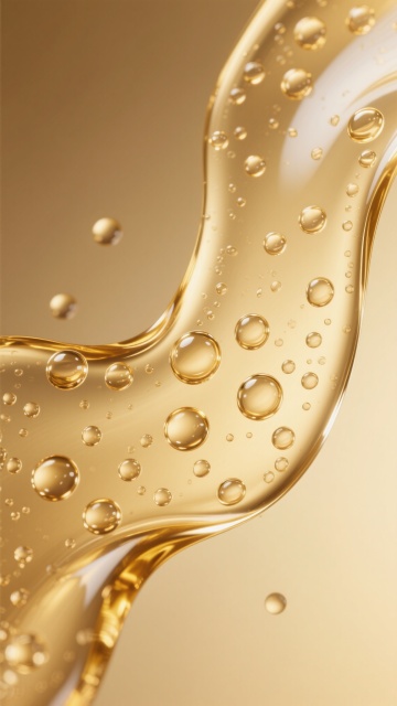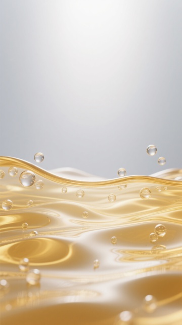 高清写实风格的精华液背景,主色调为温暖的金色与透明感交织,柔和的光线从画面上方洒下,形成明亮的高光和细腻的阴影,营造出奢华、纯净且富有活力的氛围。画面中央是一颗放大的透明精华液水珠,内部清晰可见悬浮的小分子结构和微小气泡,水珠周围环绕着流动的金色精华液波纹,呈现出丝绸般顺滑的质感和动态的流体形态。背景中散布着大小不一、晶莹剔透的水珠和气泡,有的轻盈上浮,有的随波纹流动,整体构图采用三分法,视觉焦点集中在中央水珠与流动波纹的交汇处,突出精华液的水润、滋养与活性特性,展现不同画面内容中精华液的纹路美感,如波纹的曲线韵律、水珠的球面折射以及分子结构的精致纹路,整体画面简洁干净,信息传达高效,符合高端护肤品的视觉审美。