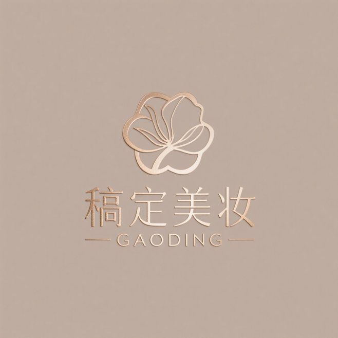 Logo设计,美妆logo设计,元素:极简抽象花卉样式,风格:金属质感+极细线条,字符“稿定美妆”,下面一行小字“GAODING”,字体:纤细衬线体,整体呈现优雅轻奢感,适配烫金工艺,纯色背景