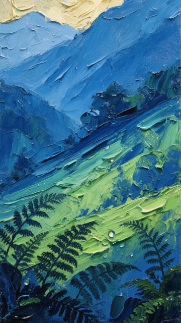 一幅以深邃静谧的靛蓝色与苍翠绿色为主色调的油画,保留了原作中粗犷有力、富有肌理感的厚重油画笔刷笔触,呈现出斜向流动的纹理走向,画面中融入了自然景观元素,如远处朦胧的山峦轮廓、近处点缀的蕨类植物叶片剪影,以及在笔触间隙隐约可见的露珠反光,整体色调从温暖的金色转变为冷调的蓝绿色系,但依然保持了颜料堆叠产生的立体质感和光线在不同笔触角度下折射出的微妙光泽变化,营造出宁静而富有生命力的自然氛围。
