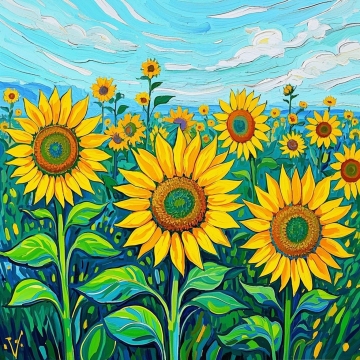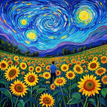 梦幻感的插画风油画,印象画派手法描绘向日葵田与星空,色彩斑斓,意境深远。