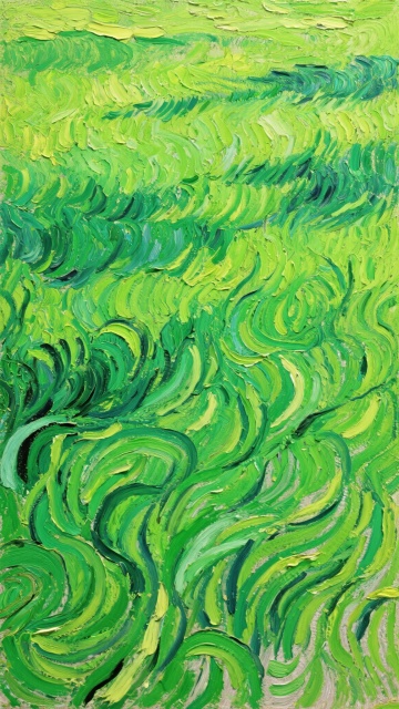 梵高风格的绿色草地,浓郁的翠绿色笔触,旋转扭曲的草叶形态,厚重的油画质感,强烈的色彩对比,充满动感的笔触纹理,大面积的绿色覆盖画面,局部有深浅不一的绿色变化,阳光照射下的明暗交错,艺术化的自然景观,充满生命力的草地,后印象派绘画风格,笔触奔放有力,色彩饱和度高,整体画面富有韵律感和视觉冲击力。