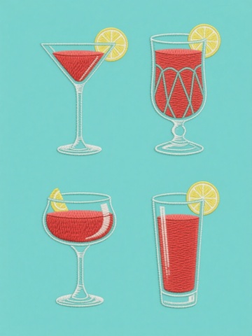 一系列四个不同的冰镇饮料插画,保持相同的卡通风格和玻璃质感,使用不同的整体色彩,每个杯子里装有不同的水果片和冰块,背景为纯色,所有元素规整排布,高光和阴影处理一致,杯身有菱形格纹设计,展现清爽透明的视觉效果。