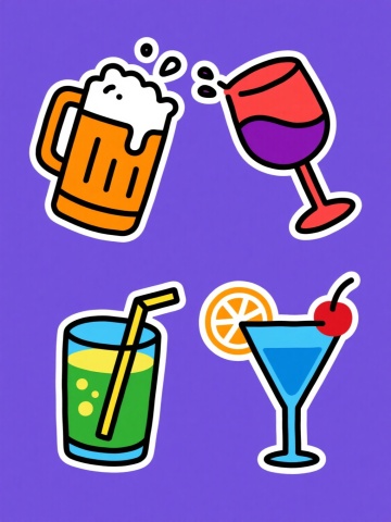 四个不同纯色背景的规整排布系列素材集合,保持粗线条手绘涂鸦风格,黑色轮廓线勾勒,内部填充鲜明色彩。第一个元素:橙色啤酒杯碰撞飞溅白色泡沫;第二个元素:红色葡萄酒杯倾斜溢出紫色酒液;第三个元素:绿色果汁杯插着黄色吸管带有气泡;第四个元素:蓝色鸡尾酒杯装饰橙色柠檬片与红色樱桃,所有元素保持相同手绘质感与构图比例,整体呈现欢快饮品主题的系列图标设计。