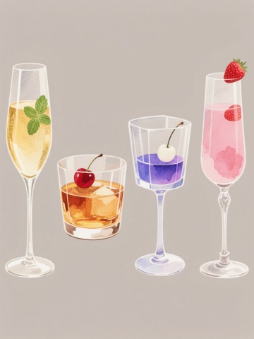 一系列四个不同色彩的鸡尾酒插画,保持相同的扁平风格和水彩质感,每个鸡尾酒都有独特的色彩和装饰,规整地排列在纯色背景上。第一个是粉色草莓玛格丽特,带有草莓装饰;第二个是蓝色夏威夷,点缀着菠萝片;第三个是绿色薄荷莫吉托,配有薄荷叶;第四个是橙色日出特饮,带有橙片装饰。所有鸡尾酒都使用透明玻璃杯,杯中有冰块和液体的渐变效果,整体设计简洁明快,适合作为系列素材集合使用。