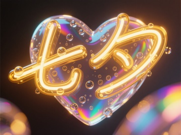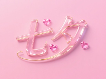 半透明凝胶材质风格文字”七夕“,层次感丰富,精致细腻唯美,线条流畅,浪漫感十足,点缀爱心、彩带等元素,简约梦幻背景,色彩鲜艳、饱和度丰富。