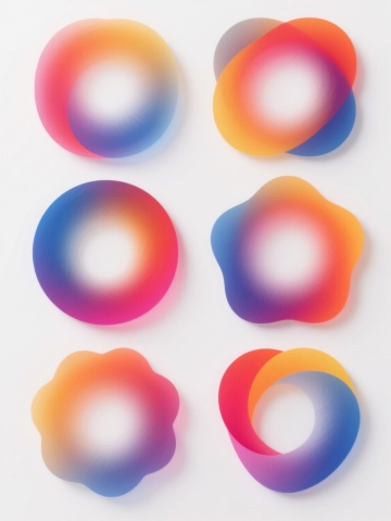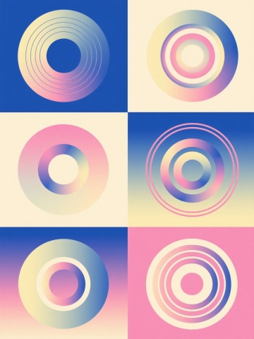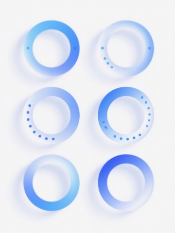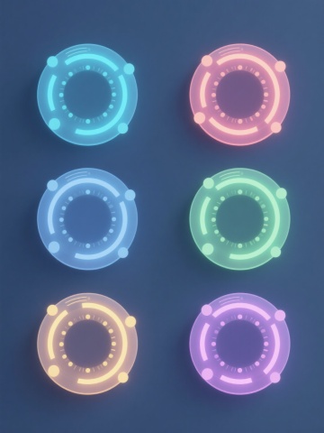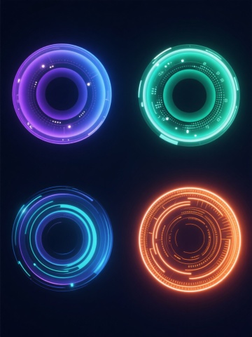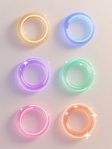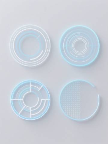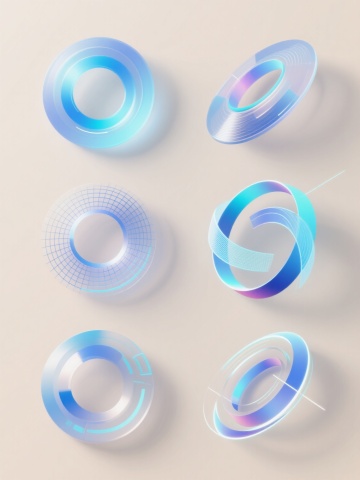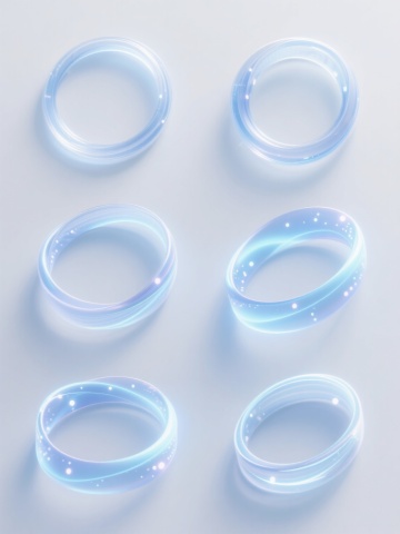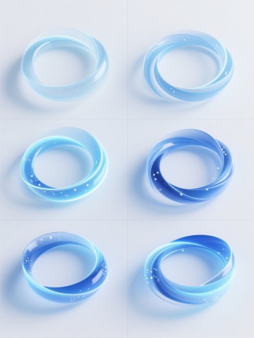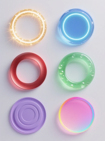四个不同风格的透明圆环元素系列素材集合,规整排布在纯色背景上。第一个圆环采用未来科技风格,以深邃的深蓝色为背景,圆环呈现出带有霓虹光效的半透明材质,边缘有蓝色的光晕;第二个圆环为极简主义风格,浅灰色背景,圆环是纯净的透明亚克力质感,线条简洁流畅;第三个圆环是复古波普风格,亮黄色背景,圆环由多层彩色透明塑料叠加而成,色彩饱和明快;第四个圆环为自然有机风格,淡绿色背景,圆环模拟水滴凝固的效果,表面有细微的纹理和光泽变化。每个圆环都保持了双层同心圆的基本造型,整体布局整齐有序,形成一组风格各异又统一的系列素材。