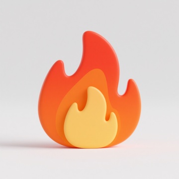 纯白色背景,单个火焰元素,规整排列,火焰呈现出橙红色渐变,边缘有黄色高光,内部有明亮的白色火焰核心,火焰形态自然流畅,具有透明的燃烧质感,火焰的动态感强,仿佛正在燃烧跳动,整体画面简洁干净,突出火焰元素的视觉效果,符合设计感,信息传达效率高。