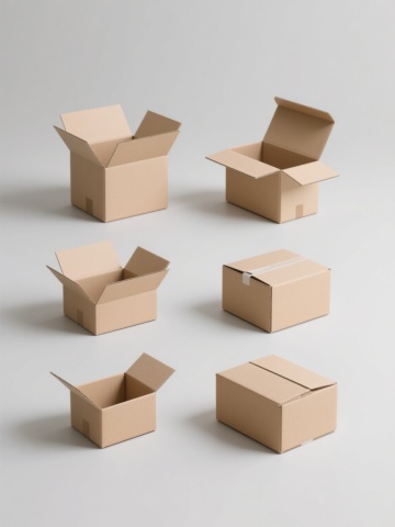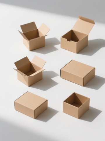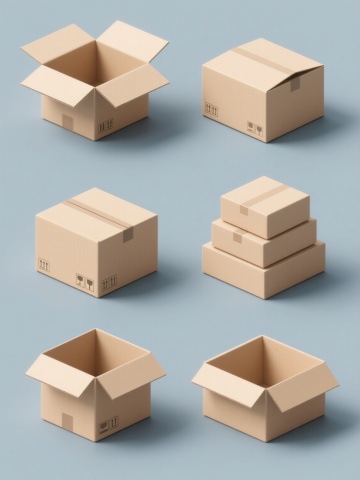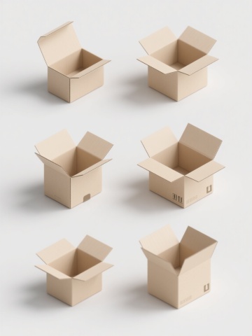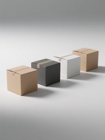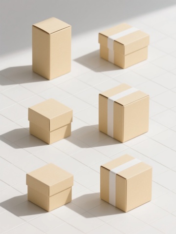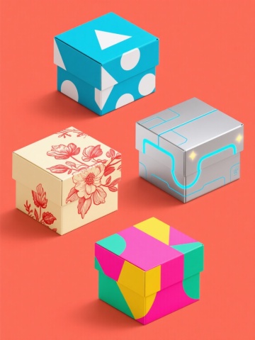 四个不同风格造型的包装盒系列素材集合,规整排布在纯色背景上。第一个包装盒为极简主义风格,白色背景,方形盒体,表面光滑无装饰,仅盒盖边缘有一圈细黑色线条勾勒轮廓;第二个包装盒是波普艺术风格,亮黄色背景,长方体盒身,盒面印有多个彩色圆形图案,颜色为红、蓝、紫、绿,图案大小不一,错落有致;第三个包装盒为复古风,米白色背景,扁圆形盒体,盒身采用牛皮纸材质纹理,盒盖处系有一根棕色麻绳蝴蝶结;第四个包装盒是未来科技感风格,深蓝色背景,不规则多边形盒体,表面有金属光泽,盒盖与盒身连接处有银色线条装饰,整体造型具有棱角感。所有包装盒都保持原有的盒子内容属性,通过不同的色彩搭配和造型设计形成系列感,画面整体色彩鲜明且风格迥异,每个包装盒都有清晰的光影效果,立体感强。