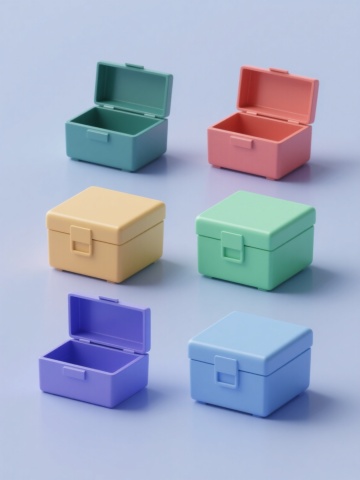 六个不同颜色、不同样式的3D风格箱子,采用简约现代的整体造型,规整排布在纯色背景上,无任何文字、logo及水印,每个箱子具有平滑的表面质感和清晰的边缘棱角,光影过渡自然柔和,保持一致的3D渲染风格,色彩鲜明且相互协调,整体画面简洁干净,突出箱子的形态美感和排列秩序。