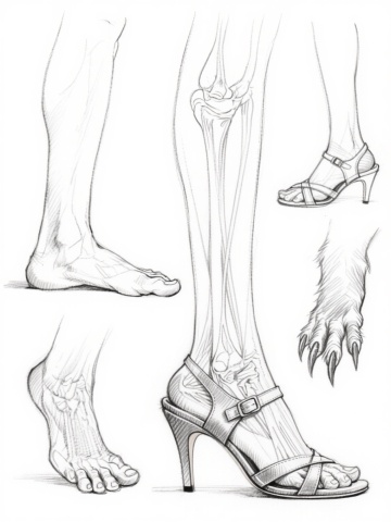 多种不同角度和姿态的脚部与腿部线稿集,包含人类赤脚、穿着凉鞋和高跟鞋的脚,以及动物爪部的结构素描,线条流畅细腻,注重解剖结构准确性,采用干净的白色背景,呈现专业的绘画参考素材风格,具有清晰的动态感和形态表现力。