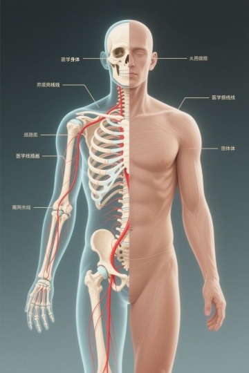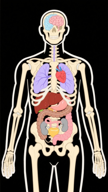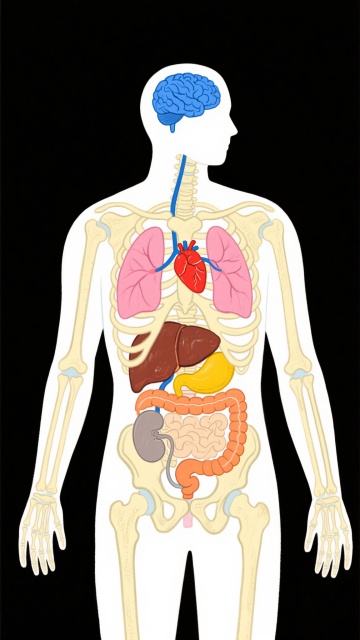 手绘风格的人体解剖示意图,以白色为背景,采用清晰的线条勾勒出完整的人体骨骼结构和主要内脏器官,骨骼呈淡米黄色,大脑为浅蓝色,肺部为淡紫色,心脏为红色,肝脏为红褐色,胃为棕色,肠道为灰色,肾脏为粉红色,膀胱为黄色,所有器官和骨骼均以简洁、平面的手绘风格呈现,无立体阴影,线条流畅且边缘平滑,整体构图为正面站立人体,各器官位置准确且清晰可见,具有科普教育性质的医疗插画风格。