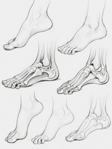 白色背景上,以清晰流畅的黑色线条绘制的多种角度和姿态的足部解剖学素描,包含脚踝、脚掌、脚趾的结构转折与动态变化,线条简洁有力,注重骨骼与肌肉的结构关系,呈现出速写风格的人体足部形态研究集合,具有明确的教学参考性质,画面布局均衡,各足部姿态互不重叠且清晰展示。