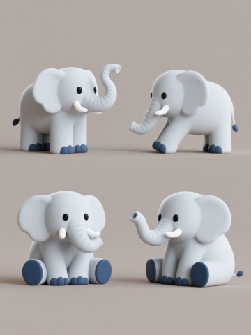软3D风格的童趣动物系列素材集合,四个角色规整排列在同一画面中,每个角色独立在纯色背景上,色彩鲜明充满童真。第一个是黄色身体、橙色鬃毛的微笑狮子,脸颊带有粉色腮红,线条圆润可爱;第二个是橙色身体、黑色条纹的微笑老虎,同样有着粉色腮红和圆润轮廓;第三个是灰色身体、白色象牙的微笑大象,耳朵宽大,表情温和;第四个是白色身体、黑色条纹的微笑斑马,造型简洁明快。所有角色均采用统一的软3D质感,边缘有轻微阴影增强立体感,整体画面和谐统一,充满童趣和设计感。