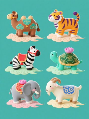 纯色背景,软3D风格,画面整体色彩变换,规整排布的6个完全不同元素内容的系列素材集合,包含蝴蝶、猫咪、鱼、恐龙、斑马、小鹿,每个元素都具有圆润的边缘和柔和的光影效果,视觉层级清晰,设计感十足,适合作为系列素材使用