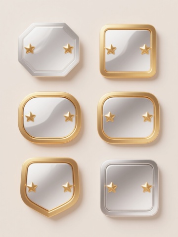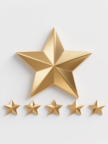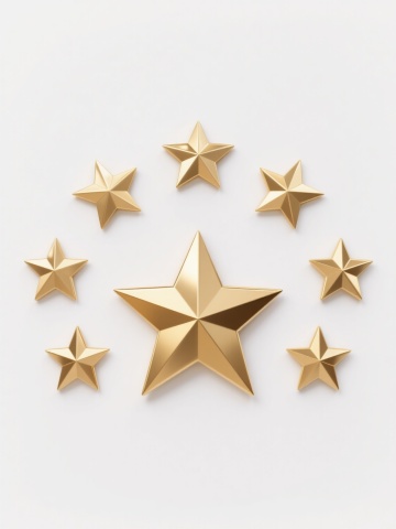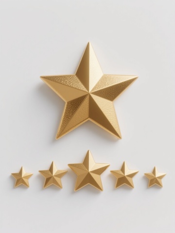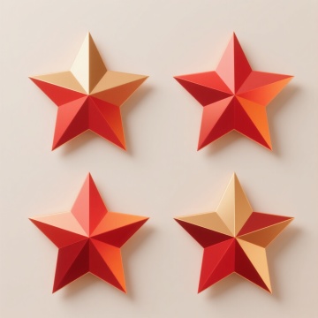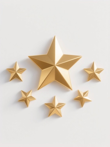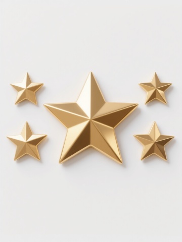 一组4个不同配色、不同样式、不同材质的五星造型,符合现实逻辑,浅色背景,上下两行对齐排列,五星造型包括:1. 亮金色实心五角星,边缘锐利,表面光滑有金属光泽;2. 黄色空心五角星,线条流畅,内部无填充;3. 金黄色立体五角星,有明显的棱角和阴影,呈现出3D效果;4. 橙黄色渐变五角星,颜色从中心向外逐渐变浅,表面有柔和的光泽。整体设计简洁大方,视觉层次分明,信息传达效率高,符合现代设计感。